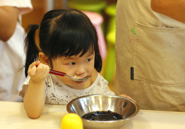 正在試範給小小孩"怎麼切仙草?"和"怎麼舀糖水?"的小樺阿姨。