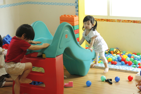 除了上課的教室外,旁邊還有兩間堆滿玩具的小房間,目的是讓不想聽故事或課後留下來的小朋友玩玩具。這裡除了小朋友一起開心玩具具的畫面外,還會天天上演搶人玩具,玩具被人搶,大欺小,小巴大,大打小,小推大的戲碼。新來的媽媽對於自己的小孩被打或打人很容易大驚小怪,但有經驗的媽媽除非是小孩大哭否則多半不會介入(因為媽媽都自顧自在外面聊天,哈哈哈...哈哈哈....),因為看久了就會明白那是小朋友的相處模式,小孩子會有自己的一套解決方案,無論是反擊或默默承受,那都是小朋友自己的抉擇,也是一個個自己與同儕相處的學習進程,大人實在不必過度保護或怕別人誤認為自己都沒在教小孩而罵小孩給別人看,只要讓小孩知道這樣做人家不喜歡就可以了。