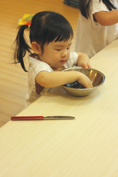 一邊認真吃,一邊認真看試範的黃小甯。(都被妳吃掉了,等下要切空氣呀?)